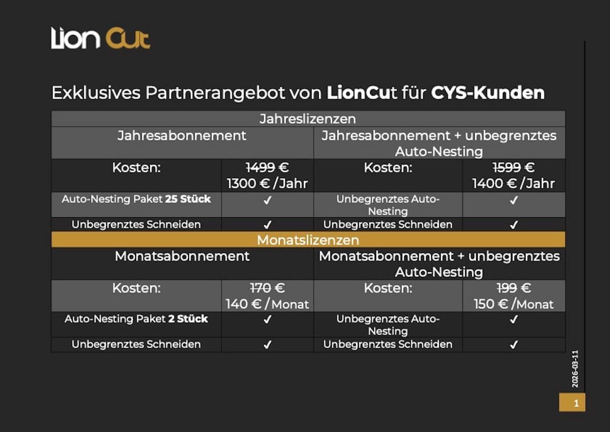 Aufgrund zahlreicher Nachfragen möchten wir jedoch eine Empfehlung für die Software von LionCut aussprechen. Diese ist herstellerunabhängig und in vielfältigen, bedarfsgerechten Varianten erhältlich.